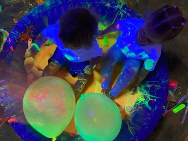 Incredible glow-in-the-dark UV paint sessions that spark creativity and encourage messy play in an indoor space, you don't have to clean up.