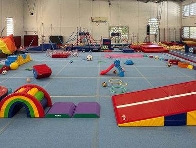 An indoor gym play session for little ones, with climbing, swinging, and jumping fun.